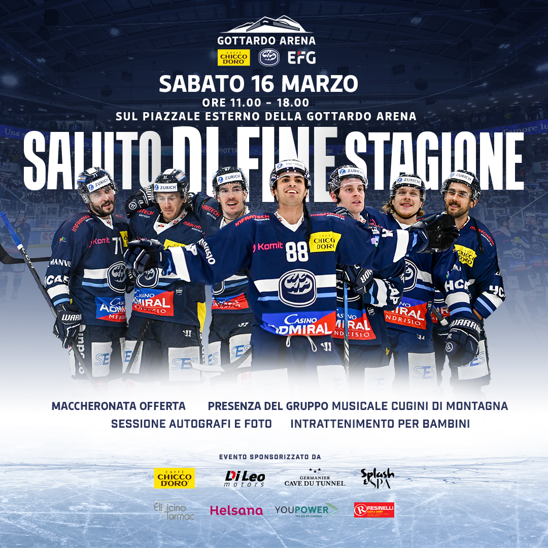 Der Hockey Club Ambrì-Piotta teilt mit, dass am Samstag, 16. März, auf dem Platz neben der Gottardo Arena die Saisonabschlussfeier stattfindet.