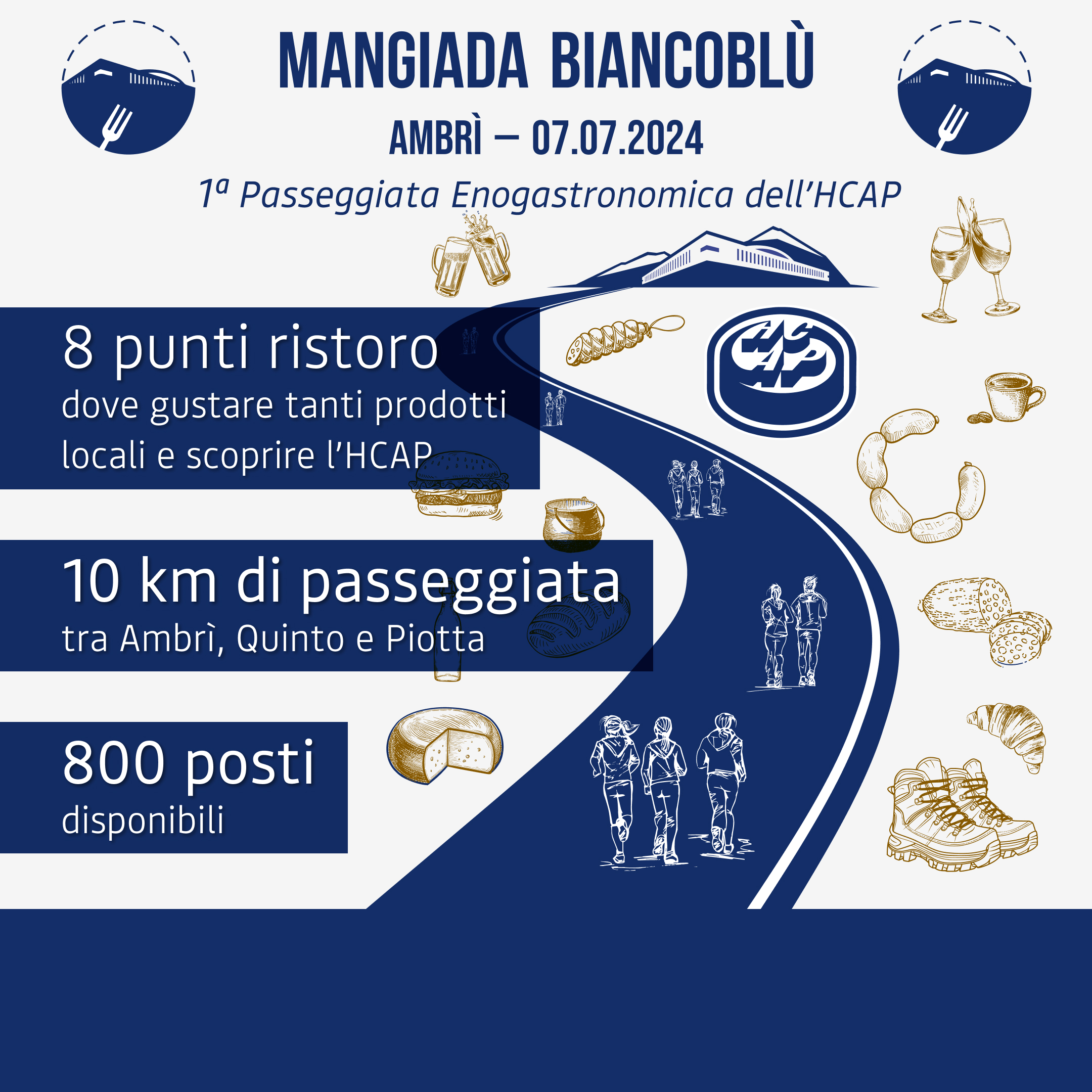 Die «Mangiada Biancoblù» ist die erste gastronomische Wanderung, welche dem HC Ambrì-Piotta gewidmet ist. Ein Spaziergang, der für alle geeignet ist, um Ambrì und die unverfälschten Schönheiten der Leventina zu entdecken, aber auch einige kulinarische Überraschungen bereithält. An jeder Station kann man etwas über die Vergangenheit, Gegenwart oder Zukunft des HCAP erfahren. Die Veranstaltung findet ganztags statt, und zwar von 09:00 bis 18:30 Uhr.